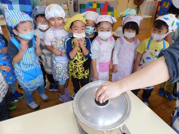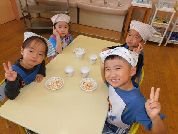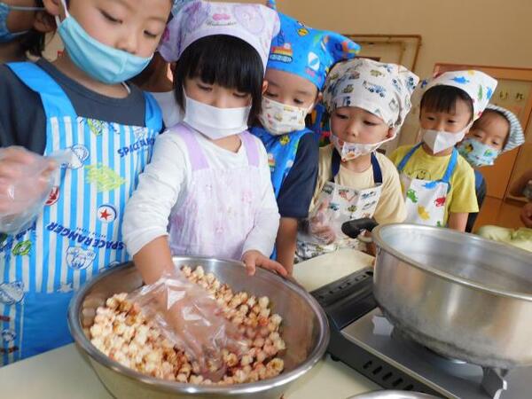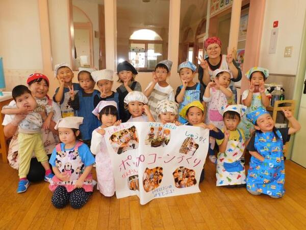 | かえる組(4歳児)のお友だちがポップコーン作りをしました。春から育てたトウモロコシを収穫し、乾燥させてから作ったので春からずっーと楽しみにしていたこどもたちでした(*^▽^*)味付けもイチゴ味やコンソメ味、のり塩味色々な味にチャレンジしました!何味がおいしかったかな⁉ | ||
