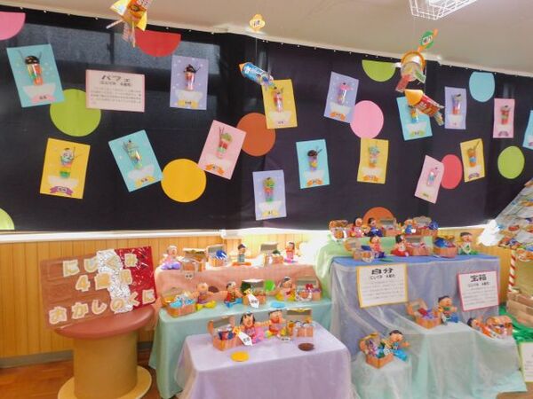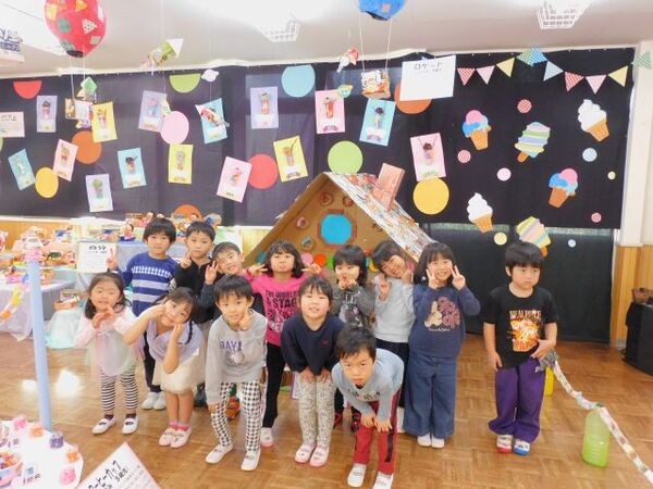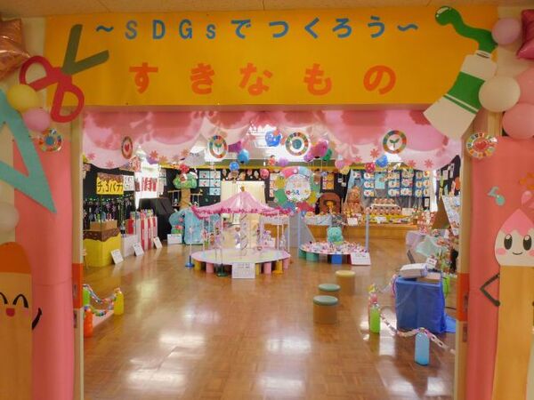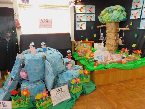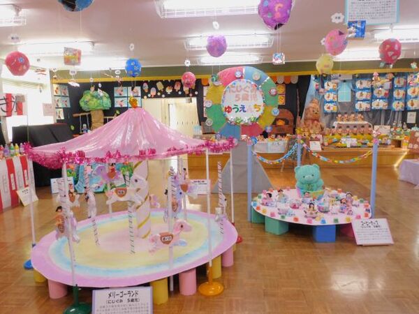 | 10月ふれあい作品展を行いました。 今年度は『〜SDGsでつくろう〜すきなもの』をテーマに各クラスがすきなものや作りたいものを話し合い季節の自然物や廃材など材料を工夫し製作しました。一人ひとりがイメージを膨らませ作る作品は使う素材・題材が同じでも出来上がりはそれぞれ違い、アイディアや個性、たくさんの夢が詰まった作品展となりました。 |