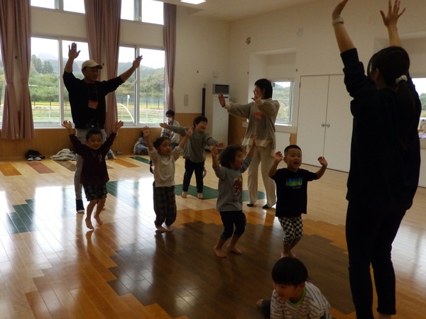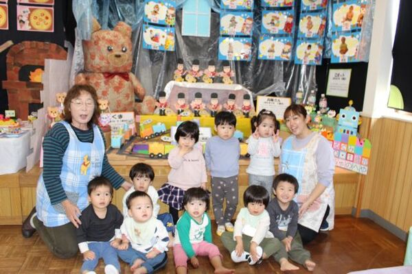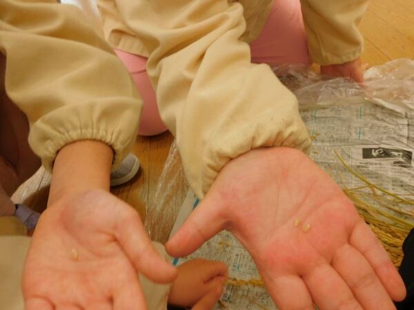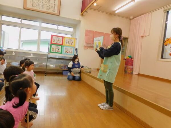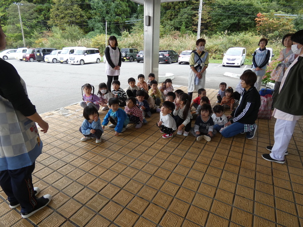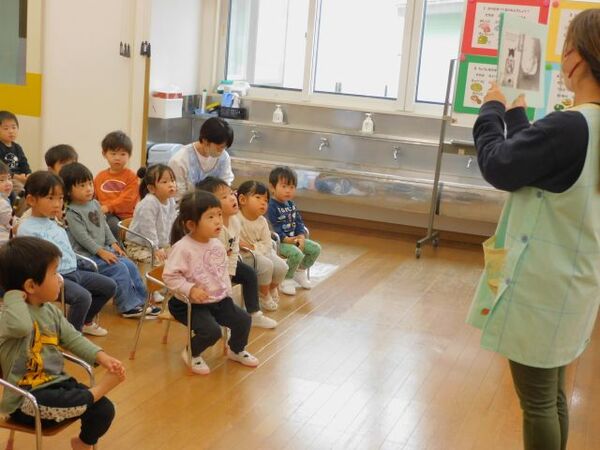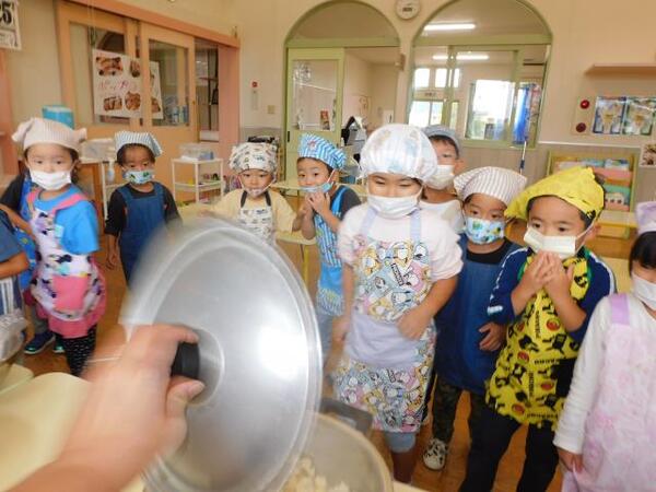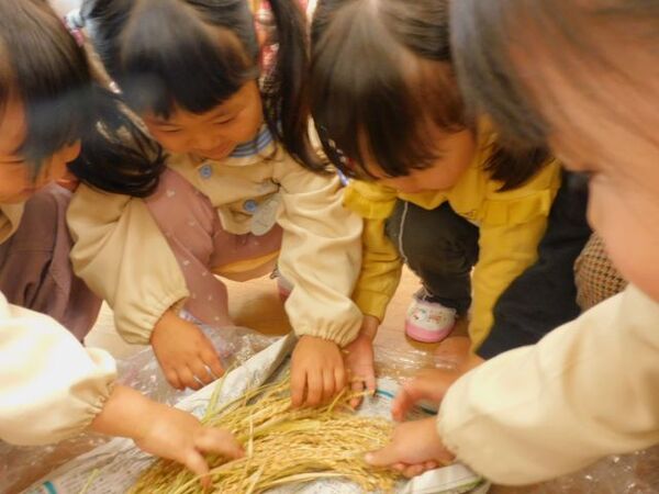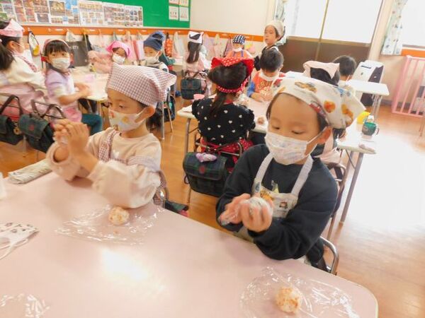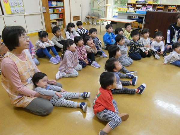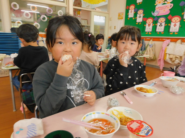| 10月の食育集会はお米の収穫について紙芝居やシアターをみながら栄養士の先生から教えていただきました。実際に稲に触れ、中からコメが出てきたのには驚いていたこどもたちです。集会後はみんなでクッキング。かわいい手でゆっくり優しくおにぎりを握っていました。 | ||