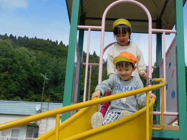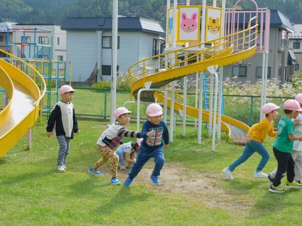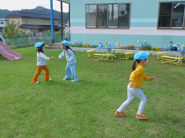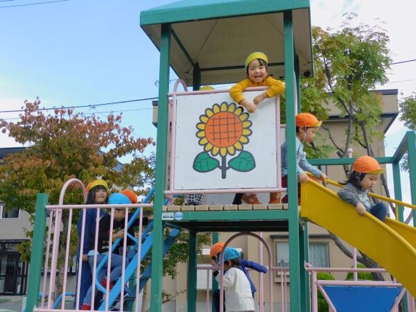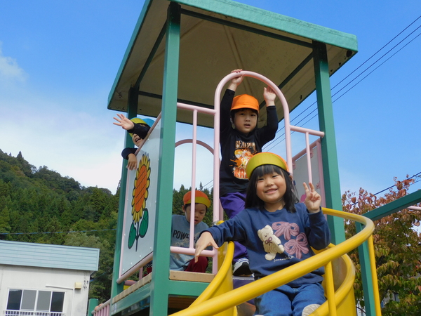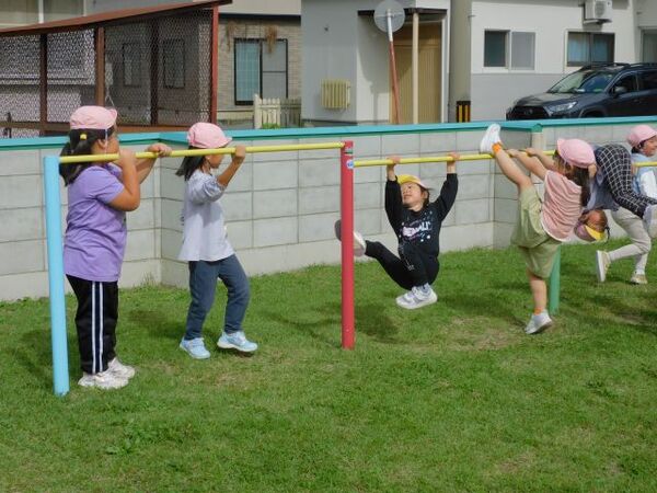 | 秋晴れの一日。にじ組4・5歳児さん、ほし組3歳児さんが戸外遊びを楽しみました。友だちと遊具で遊んだり、鉄棒にチャレンジしたり、鬼ごっこをするなど、それぞれ思い切り体を動かしてたーくさん遊びました。楽しかったね♪ | ||