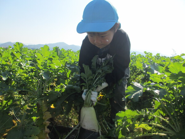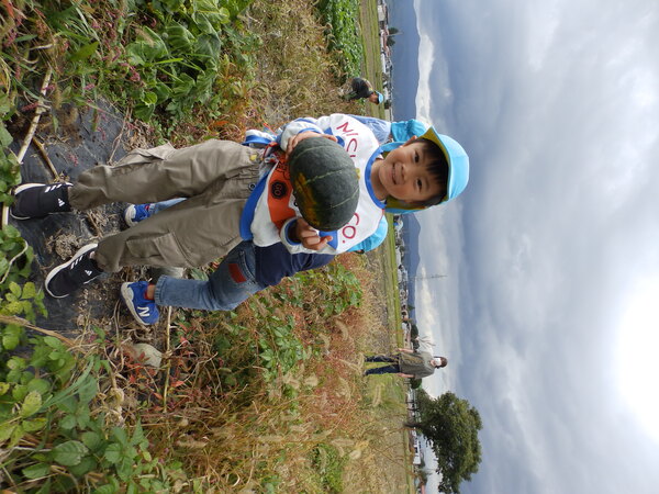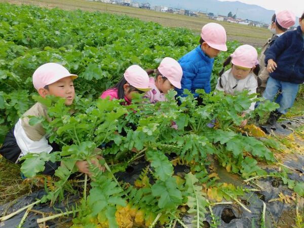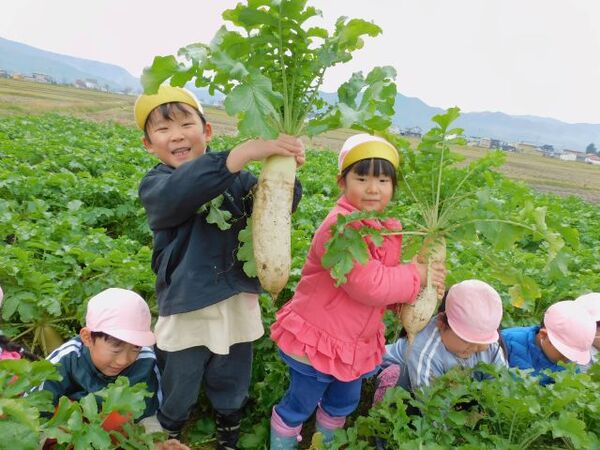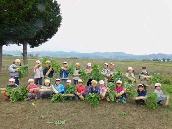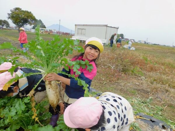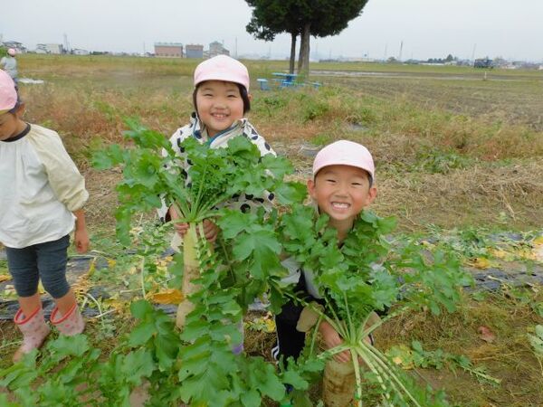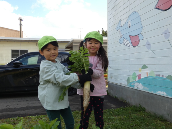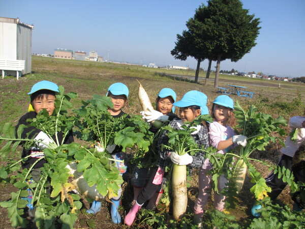 | 11月、にじ組5歳児さんがラビット農園へ大根堀りへでかけました。長い葉っぱをうんとこしょどっこいしょと力をいれて引っ張ると大きな大根が顔を出し大喜び。夢中で大根堀りを楽しんでいたこどもたちです😊 | ||