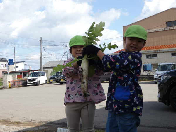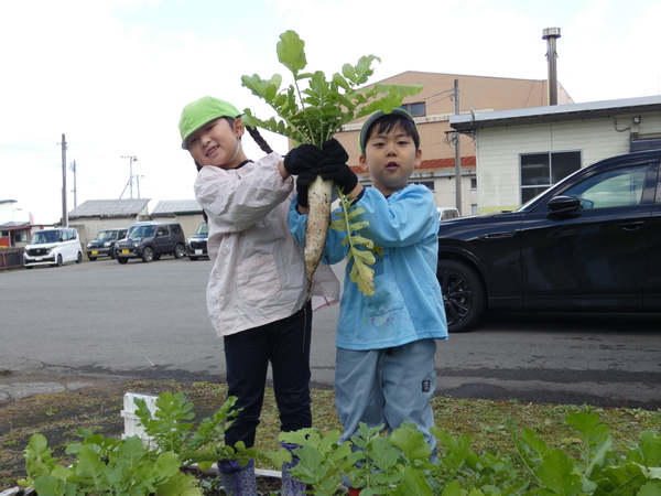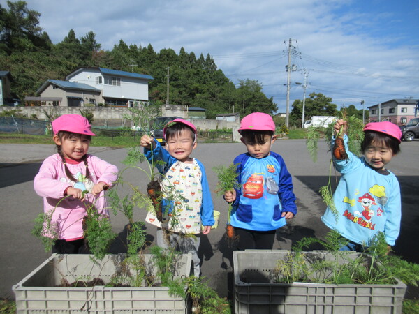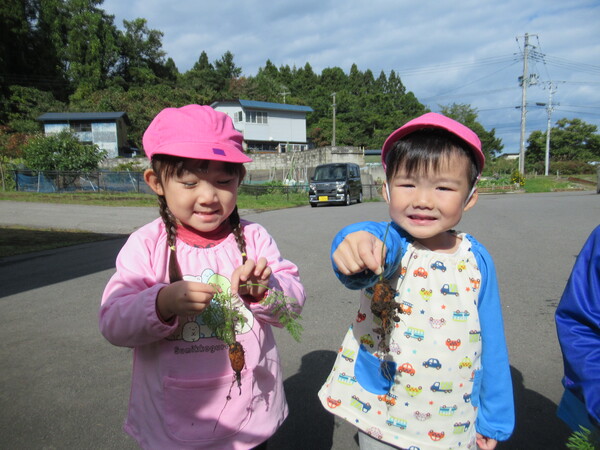 | みんなが育てた人参、大根が収穫の時期を迎えました。大きいのも小さいのもいろいろなサイズの野菜が育ちましたよ。草取りや水やりをして一生懸命育てた野菜です。給食の食材としてみんなで食べます。楽しみだね!! | ||