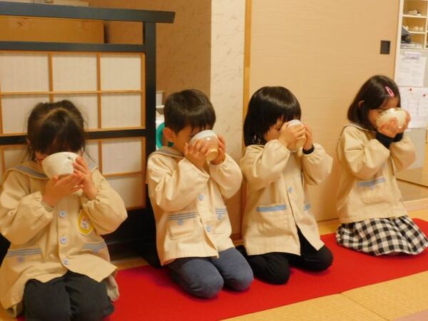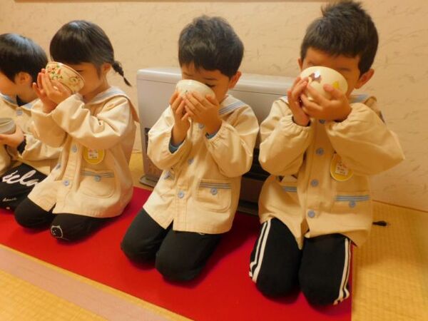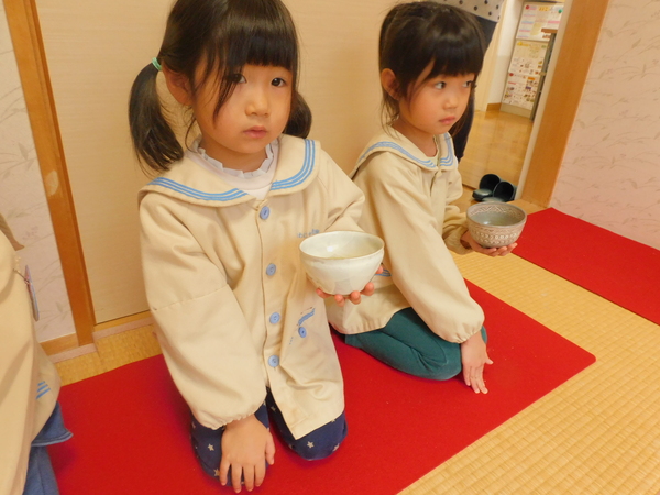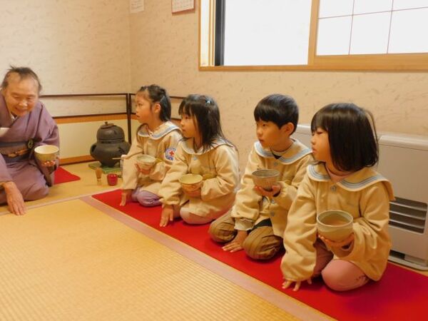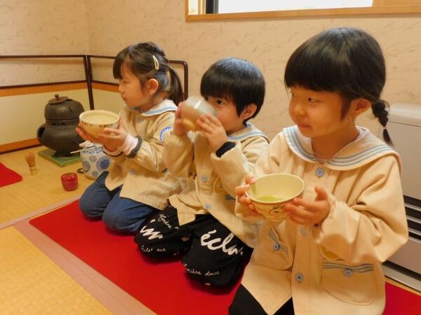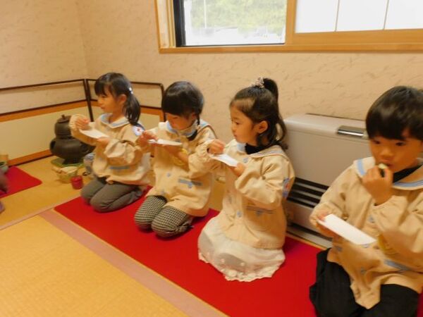| 11月、にじ組4・5歳児さんが七五三をお祝いしたお茶会に参加しました。お茶室に入ると背筋ものび、いつもは元気いっぱいのこどもたちも、ちょっぴり静かに…緊張感を味わいながら甘いお菓子と、ほろ苦い抹茶をいただきました♡ | ||