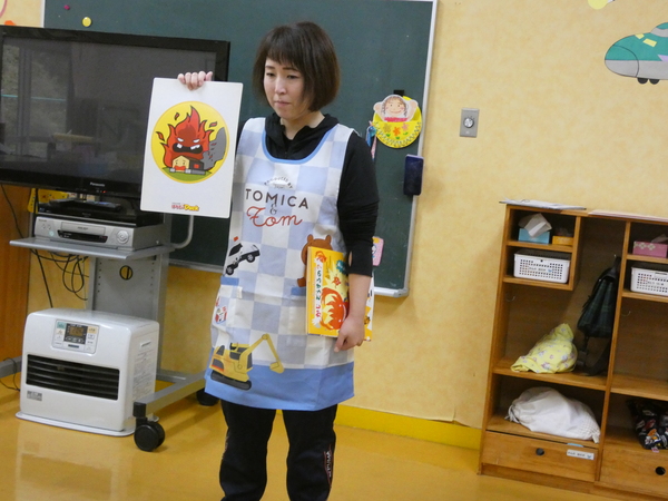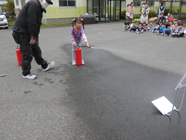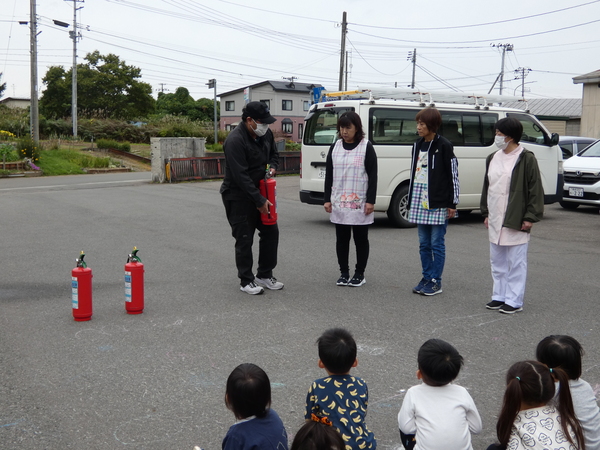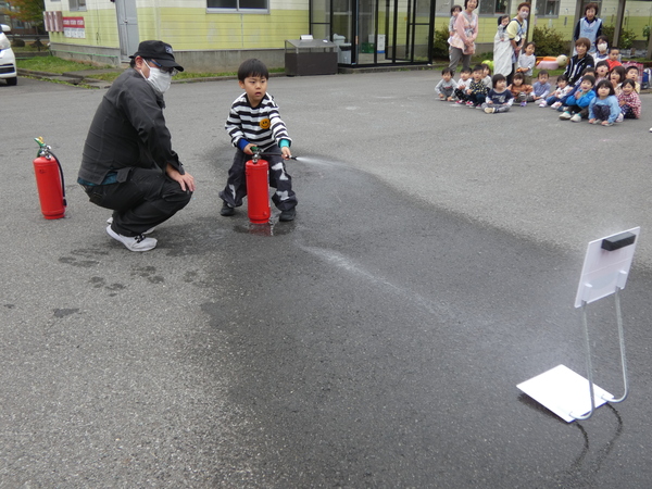 | 高谷防災さん指導の下、火災を想定した避難訓練を行いました。避難経路の確認、水消火器を使用した消火訓練など職員とこどもたちが体験をしました。いざという時に行動できるよう訓練は大切ですね。 | ||