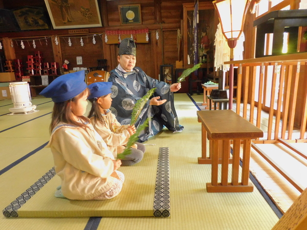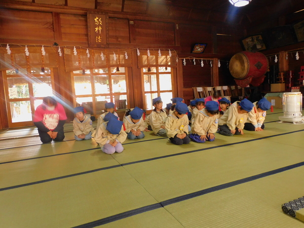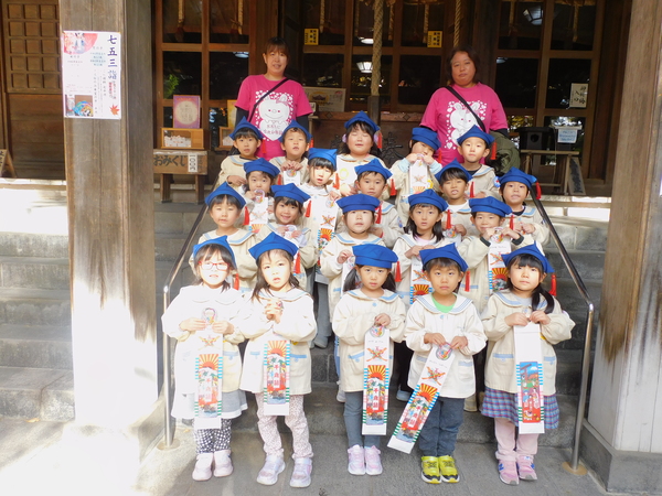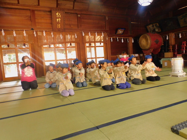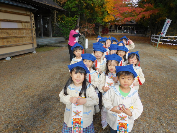 | 11月、にじ組5歳児さんが園を代表して猿賀神社へ七五三お宮参りへでかけました。これからも健やかに元気いっぱい成長できるように、ちょっぴり緊張しながらご祈祷していただきました。 | ||