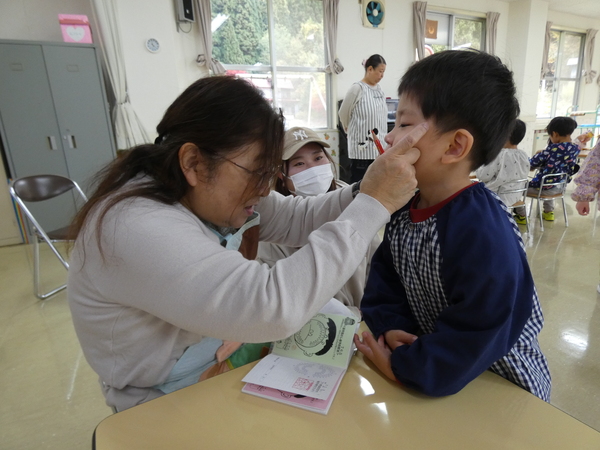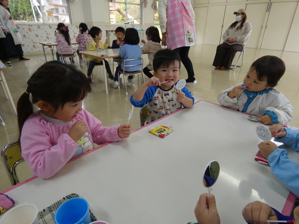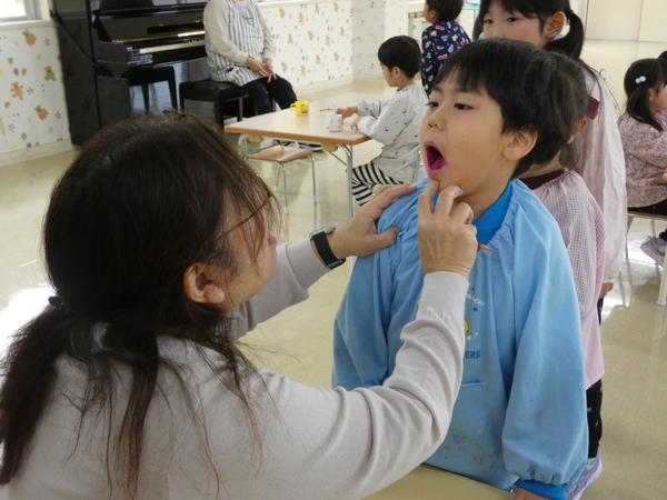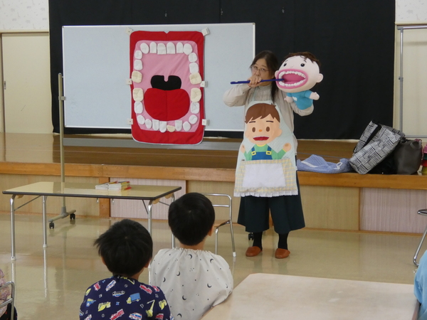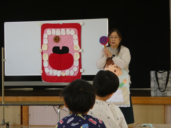 | 歯科衛生士さんによるむし歯予防教室(歯科指導)が行われました。むし歯にならないためには食べた後に歯磨きをするよう約束しました。歯垢の染め出しを行い、磨き残しを知り、次回はその部分をしっかり磨くよう、お話がありました。紙芝居を読んでもらい、歯に対する理解を深めていたこどもたちです。 | ||